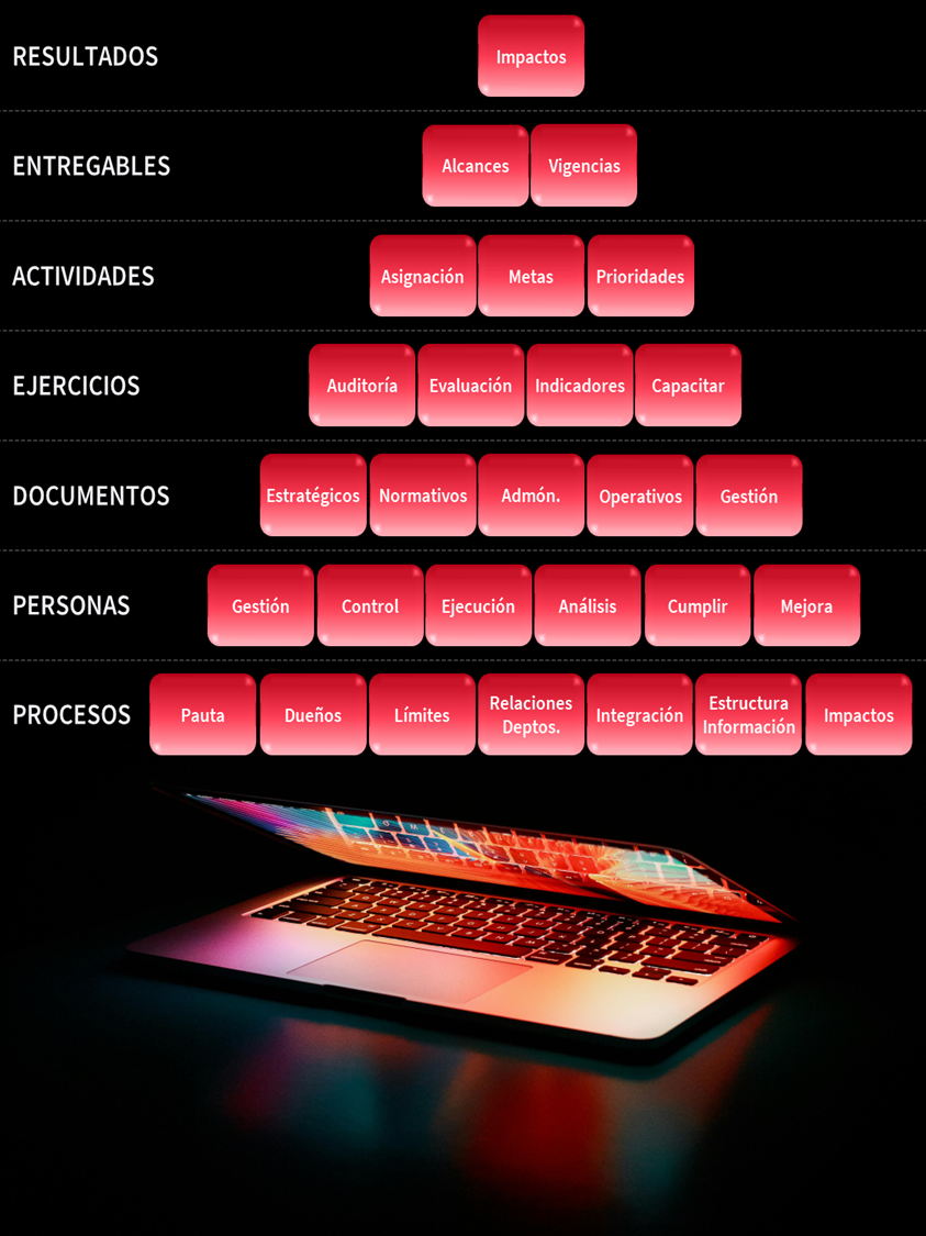 Con esta definición en nuestro ADN colaboramos contigo y tus equipos de trabajo para que la operación de tus diferentes departamentos dentro de la organización se lleve primeramente como si fueran un conjunto de sistemas y posteriormente se haga de manera automatizada a través del uso de tecnologías de información.